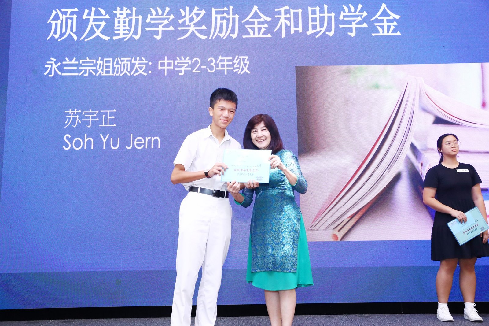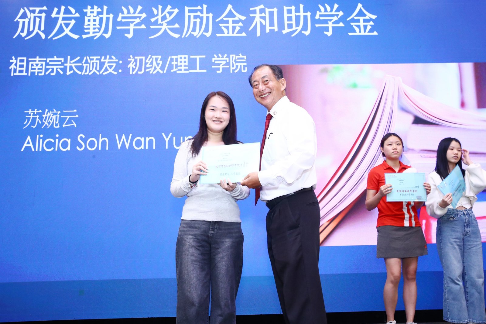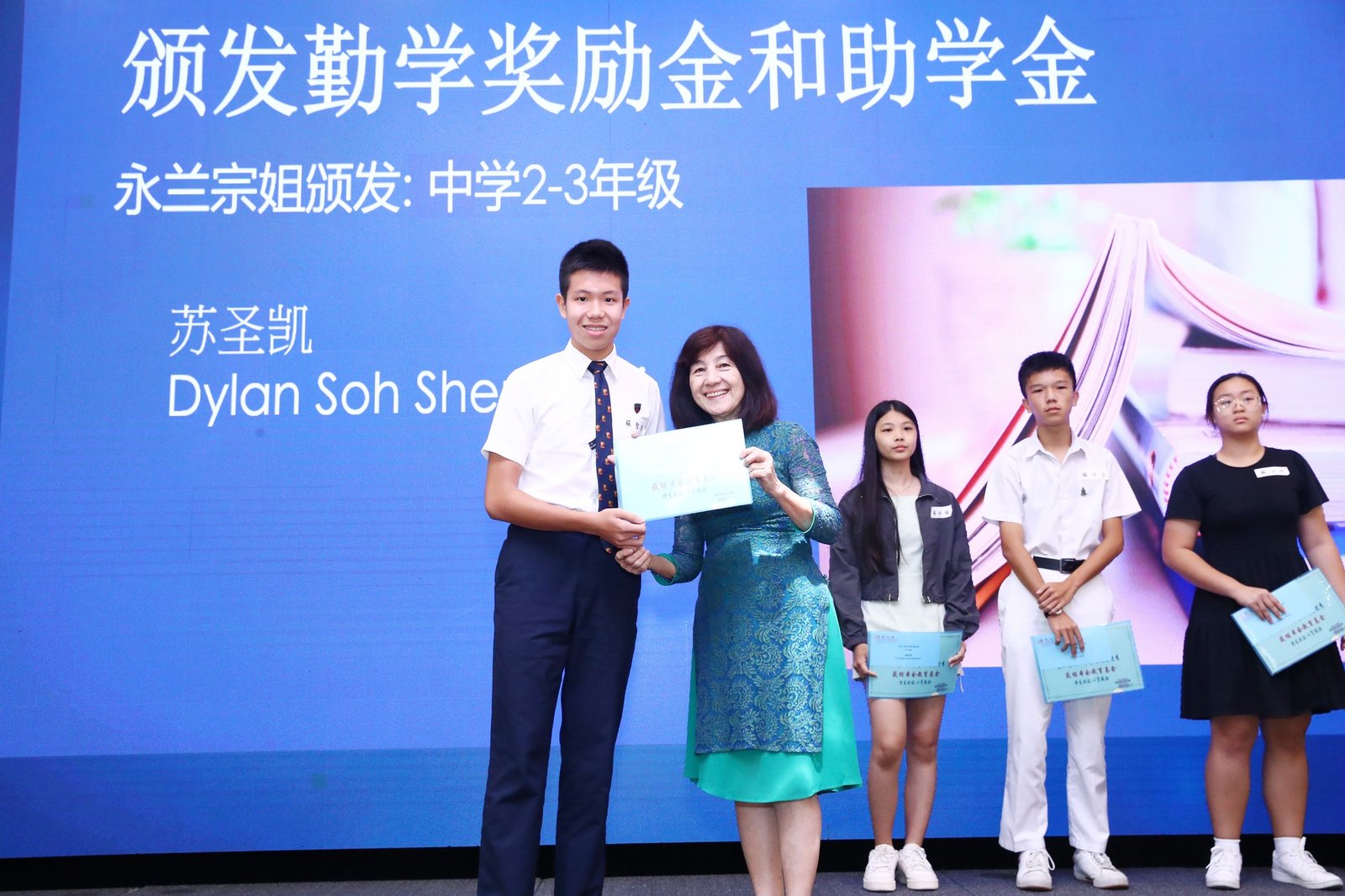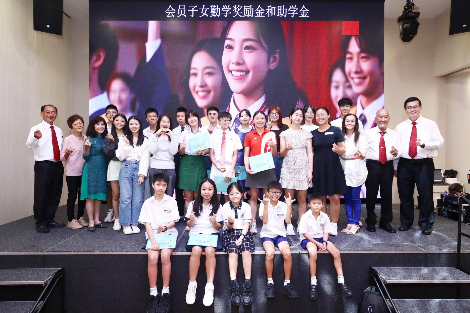 Subsequently, the ‘Scholarship and Bursary Awards for Diligent Descendants’ ceremony commenced. This year saw 23 awards presented, spanning primary school through polytechnic levels. Awards were conferred upon students in each category by Madam Jin De, Madam Yu Mei, Madam Yong Lan, Elder Neng Tong, and Elder Zu Nan respectively.
